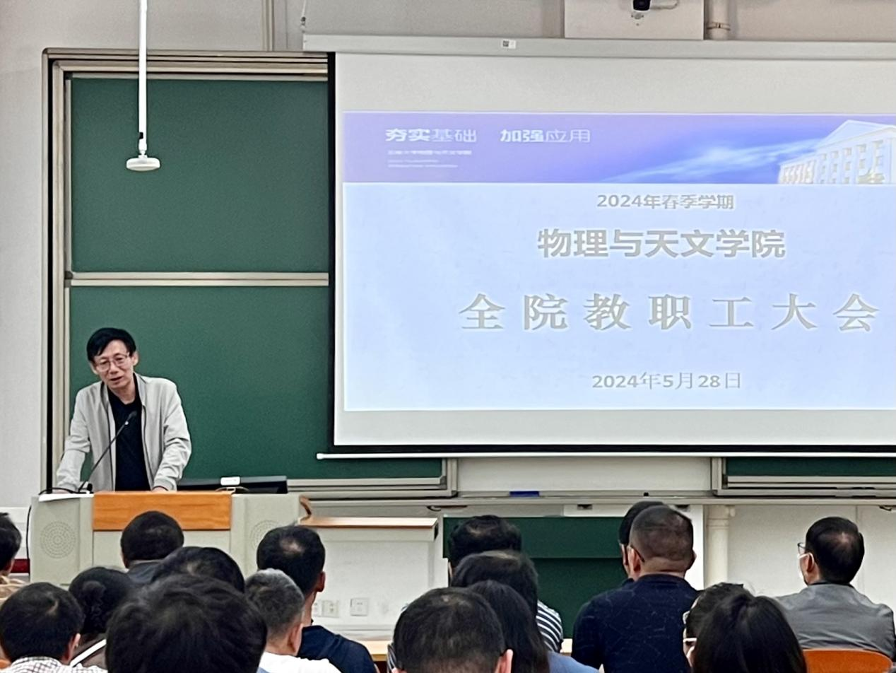 为进一步落实本科教育教学审核评估工作要求,推进学院审核评估工作走深走实,2024528日下午,物理与天文学院召开全院教职工大会,围绕本科教育教学审核评估的背景、指导思想、学校的教育教学质量保障体系、学院自评报告、校内交叉检查整改工作等方面进行宣讲,会议由学院分管本科教学的江楠副院长主持。