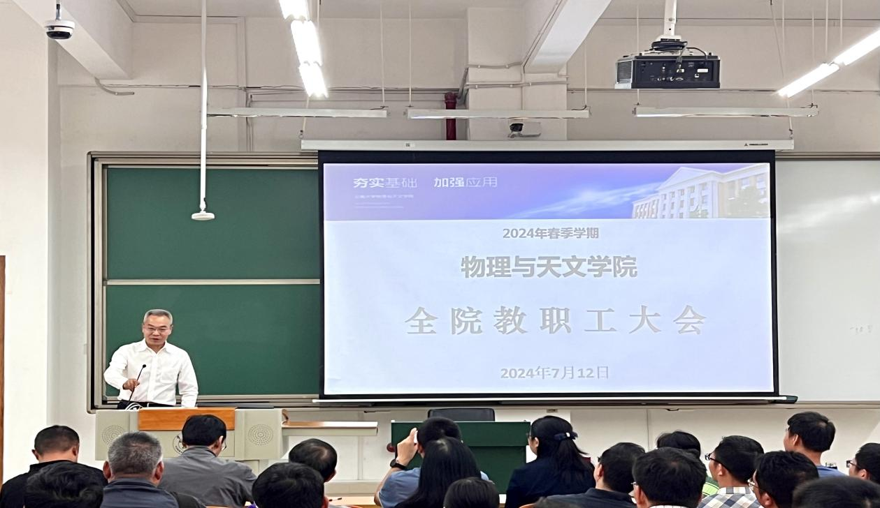 2024年7月12日,物理与天文学院召开教职工大会,总结学院2024年上半年工作,安排部署党纪学习教育、巡视整改、学院本科教育教学审核评估、研究生培养、学科建设、实验室管理和暑期安全等工作。
