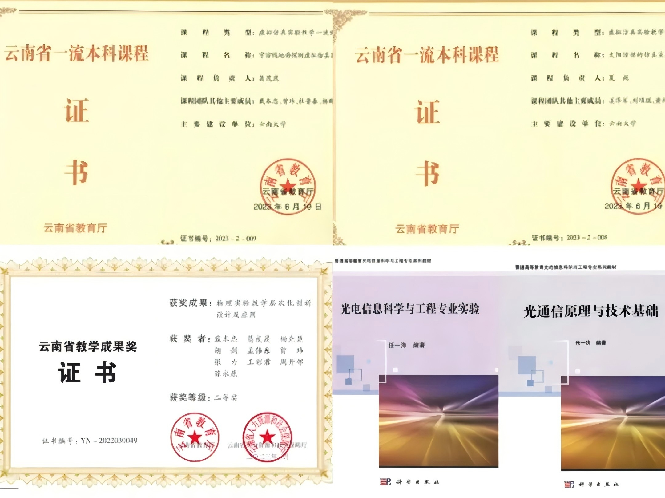 近年来,《大学物理A:力学》《大学物理C》入选省级线上下混合式一流课程,《宇宙线地面探测虚拟仿真实验》《太阳活动的仿真实验》入选省级虚拟仿真实验课程,《大学物理A:光学》入选校级线上线下示范课程;《大学物理实验》教材将于年内出版;“物理实验教学层次化创新设计及应用”获2022年度云南省教学成果奖二等奖。