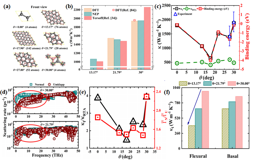 此外,该团队2024年12月发表在Physical Review B》题为“Numerical evaluation of the effect of the twist angle on phonon hydrodynamics in twisted bilayer graphene”的学术论文( https://journals.aps.org/prb/abstract/10.1103/PhysRevB.110.245305 )。将机器学习与声子玻尔兹曼输运方程相结合,研究团队首次有效地开展了对双层转角石墨烯中声子流体动力学输运行为转角依赖性的研究。该研究表明,转角会引发层间相互作用发生变化,进而导致声子 N/U 散射发生改变,最终使得声子流体动力学输运行为呈现出转角依赖性。此项研究为探索复杂相互作用下的声子流体动力学输运行为开辟了新的思路。