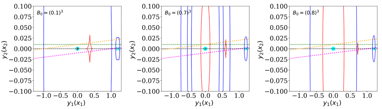 图一:不同等离子体强度下,恒星、恒星星风与行星组成系统的临界曲线和焦散线,其中蓝线为临界曲线,红色为焦散线。恒星位于青色圆形处,为平面原点,行星位于青色十字处,四条虚线表示光源位置的变化轨迹。