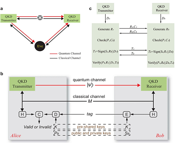 本研究成果借助后量子密码(PQC)和公钥基础设施技术,实现了对量子密钥分发的高效认证(认证过程如图所示)。