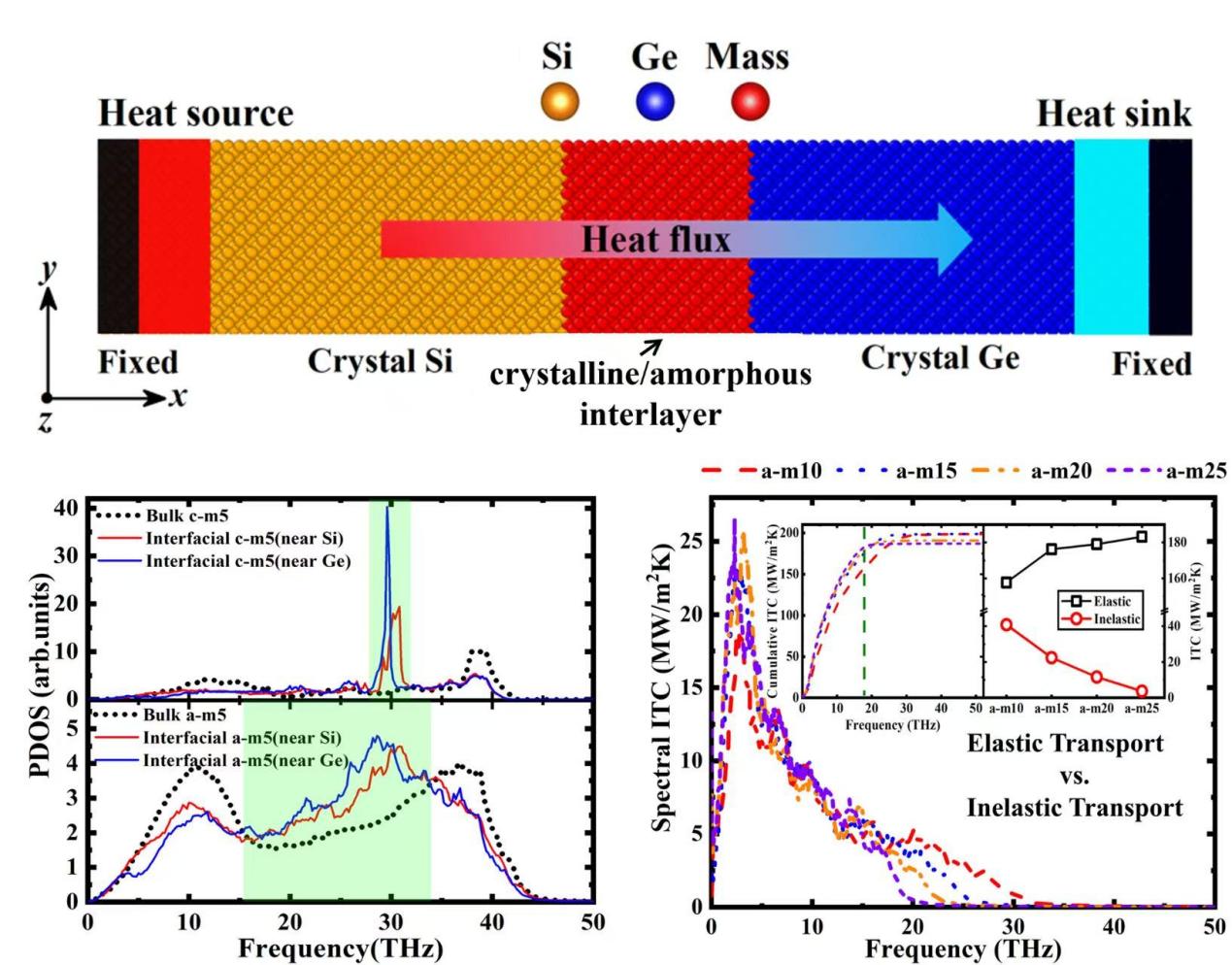 Si/晶体或非晶中间层/Ge结构示意图、非晶中间层诱导的界面模态展宽以及界面弹性和非弹性输运竞争的表征