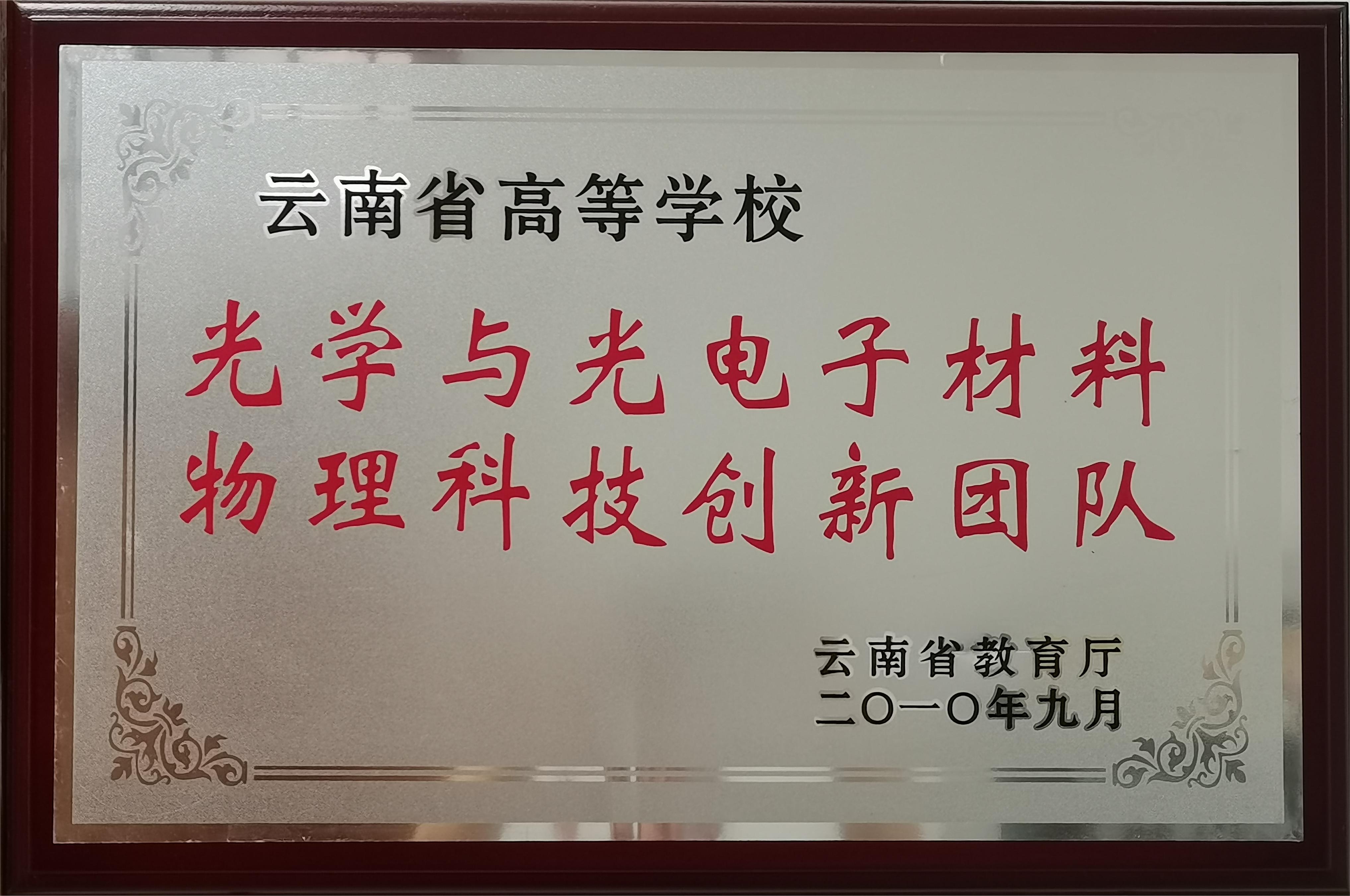 云南省高校光学与光电子材料物理科技创新团队是以部分中青年学术骨干为支柱,以物理与天文学院多年学术积淀、学科建设和实验室建设为基础,于2011年由云南省教育厅支持下建立的一支年富力强、研究水平高、有创新意识和创新能力、具备团队协作工作能力的创新团队。